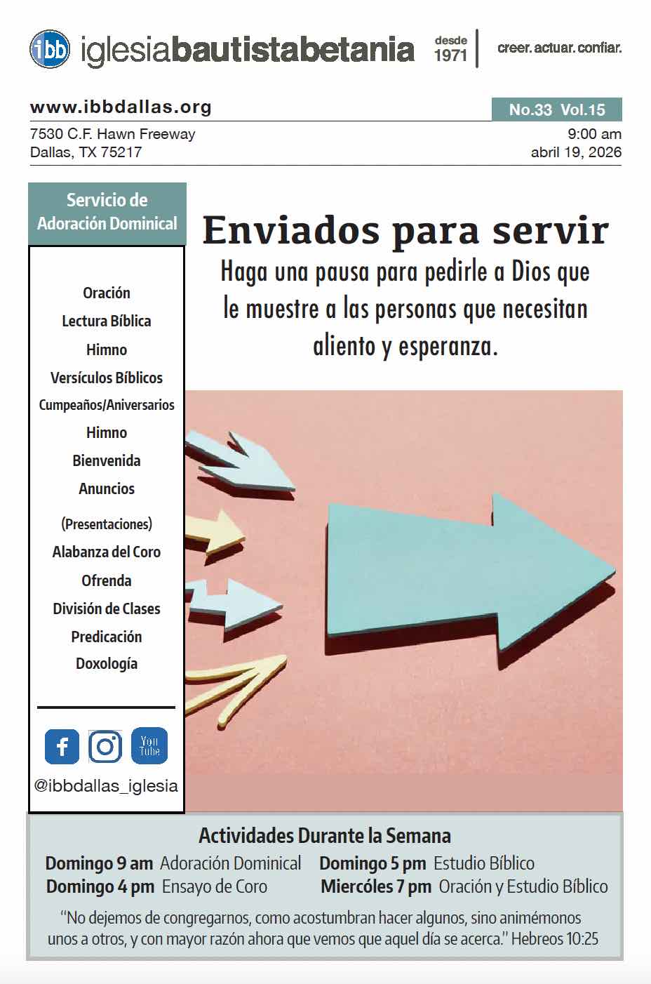 Bienvenidos al hogar de Iglesia Bautista Betania en la web – un lugar para aprender sobre nuestro ministerio y nuestro compromiso a Dios por medio de Jesucristo. Somos una familia de Cristo que poco a poco crece, tanto en tamaño como madurez, listos a darles la bienvenida hoy!